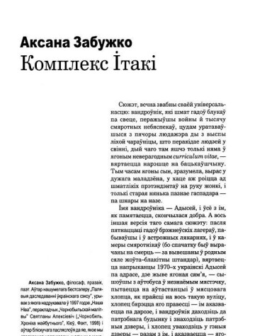 Аксана Забужка (нар. 1960, Луцк) - Філёзафка, празаік, эсэістка, паэтка, літаратуразнавец. Аўтар нашумелага бэстсэлеру “Палявыя дасьледаваньні ўкраінскага сэксу”, пачатак якога мы тутака друкуем. Перакладчыца “Чарнобыльскай малітвы” Сьвятланы Алексіевіч (Чорнобиль. Хроніка майбутнього. — Кіеў: Факт, 1998). Сярод яе апошніх кніг — манаграфія “Шевченків міф Украпни” (1997), зборнікі эсэістыкі “Хроніки від Фортінбраса” (1999), паэзіі “Новий закон Архімеда” (2000), фантастычнае прозы “Казка про калинову сопілку” (2000), публіцыстыкі “Рэпартаж з 2000 году” (2001; складзены з нарысаў, надрукаваных цягам году ў кіеўскай газэце “Столичные новости”, дзе пісьменьніца вяла калёнку).