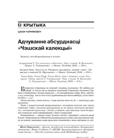 Аўтар(ы): Чарнякевіч ЦіханЧарнякевіч, Ціхан. Адчуванне абсурднасці «Чэшскай калекцыі» // № 6 (81) — 2009. С. 305—313. Выданьні, якія абмяркоўваюцца ў аглядзе: 1) Андранікава Г. Гук сонечнага гадзінніка / ...