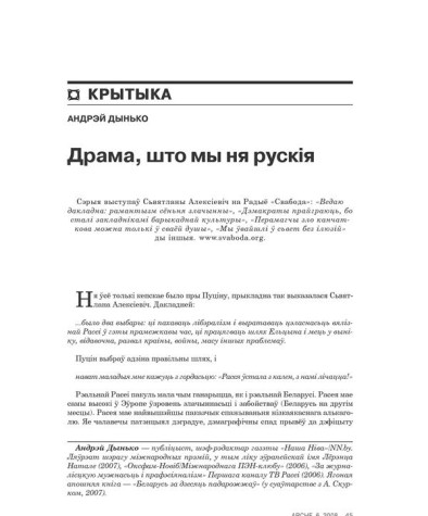 Аўтар(ы): Дынько АндрэйДынько, Андрэй. Драма, што мы ня рускія // № 6 (69) — 2008. С. 45—51. Бібліягр. у падрадк. заўвагах. У артыкуле разглядаецца сэрыя выступаў Сьвятланы Алексіевіч на Радыё ...
