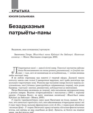 Аўтар(ы): Сальнікава ЮнэляСальнікава, Юнэля. Безадказныя патрыёты-паны // № 5 (104) — 2011. С. 240—248. Бібліягр. у падрадк. заўвагах. Выданьне, якое аглядаецца ў артыкуле: Васючэнка Пятро. Жылі-былі ...