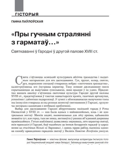 Аўтар(ы): Паўлоўская ГаннаПаўлоўская, Ганна. «Пры гучным стралянні з гарматаў…» Cвяткаванні ў Гародні ў другой палове XVIII ст. // № 7—8 (106—107) — 2011. С. 67— 83. Бібліягр. у падрадк. заўвагах. ...