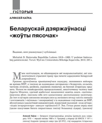 Аўтар(ы): Каўка АляксейКаўка, Аляксей. Беларускай дзяржаўнасці «жоўты пясочак» // № 4 (115) — 2012. С. 95—98: іл. Бібліягр. у падрадк. заўвагах. Выданне, якое рэцэнзуецца ў публікацыі: Michaluk D. ...