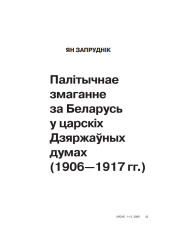 Аўтар(ы): Запруднік ЯнЗапруднік, Ян. Палітычнае змаганне за Беларусь у царскіх Дзяржаўных думах (1906—1917 гг.) // № 1—2 (76—77) — 2009. С. 43—217: табл., іл. Бібліягр. у падрадк. заўвагах і ў канцы ...