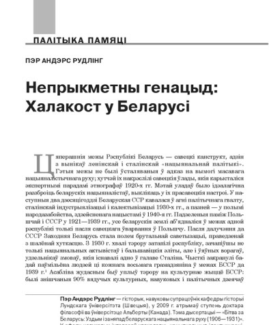 Аўтар(ы): Рудлінг Пэр АндэрсРудлінг, Пэр Андэрс. Непрыкметны генацыд: Халакост у Беларусі // № 2 (119) — 2013. С. 120—139. Бібліягр. у падрадк. заўвагах. З англійскай пераклаў Вольф Рубінчык паводле ...