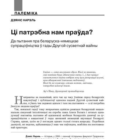 Аўтар(ы): Нарэль ДзянісНарэль, Дзяніс. Ці патрэбна нам праўда? Да пытання пра беларуска-нямецкае супрацоўніцтва ў гады Другой сусветнай вайны // № 3 (120) — 2013. С. 239—299: іл. Бібліягр. у падрадк. ...