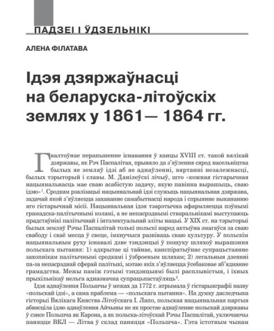 Аўтар(ы): Філатава АленаФілатава, Алена. Ідэя дзяржаўнасці на беларуска-літоўскіх землях у 1861—1864 гг. // № 12 (99) — 2010. С. 8—14. Бібліягр. у падрадк. заўвагах.