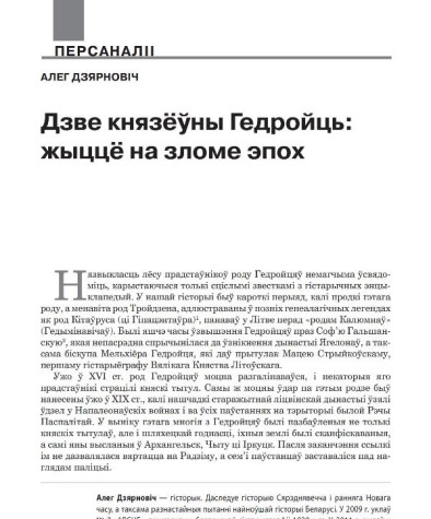 Аўтар(ы): Дзярновіч АлегДзярновіч, Алег. Дзве князёўны Гедройць: жыццё на зломе эпох // № 12 (111) — 2011. С. 155—174: іл. Бібліягр. у падрадк. заўвагах.