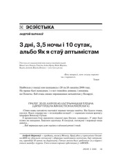 Аўтар(ы): Баранаў АндрэйБаранаў, Андрэй. 3 дні, 3,5 ночы і 10 сутак, альбо Як я стаў аптымістам // № 5 (45) — 2006. С. 49—60.