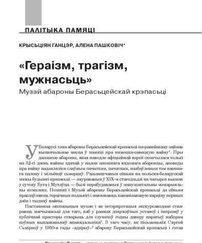 Ганцэр, Крысьціян. Пашковіч, Алена. «Гераізм, трагізм, мужнасьць». Музэй абароны Берасьцейскай крэпасьці // № 2 (119) — 2013. С. 43—59: іл. Бібліягр. у падрадк. заўвагах. Зь ...
