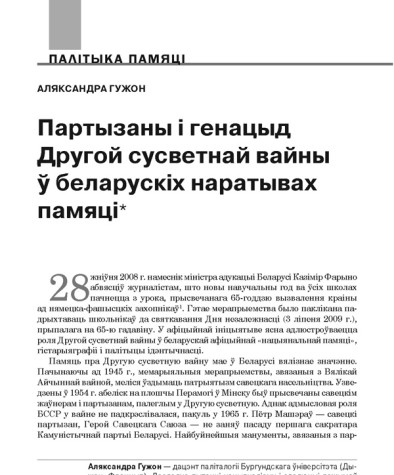 Аўтар(ы): Гужон АляксандраГужон, Аляксандра. Партызаны і генацыд Другой сусветнай вайны ў беларускіх наратывах памяці // № 2 (119) — 2013. С. 85—104. Бібліягр. у падрадк. заўвагах. Пераклаў з англійскай ...