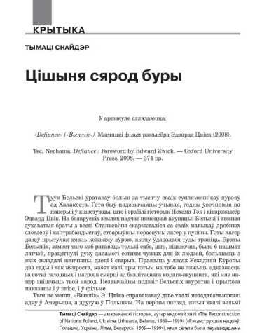 Аўтар(ы): Снайдэр ТымаціСнайдэр, Тымаці. Цішыня сярод буры // № 7—8 (94—95) — 2010. С. 20—27. Бібліягр. у падрадк. заўвагах. У артыкуле аглядаюцца: «Defiance» («Выклік»). Мастацкі фільм рэжысёра ...