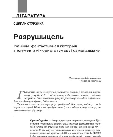 Аўтар(ы): Стурэйка СцяпанСтурэйка, Сцяпан. Разрушыцель. Іранічна-фантастычная гісторыя з элементамі чорнага гумару і самападману // № 5 (126) — 2014. С. 454—522.