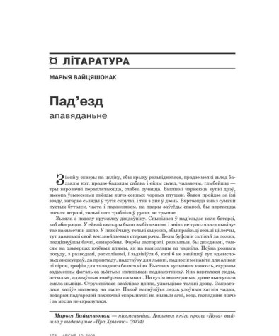 Аўтар(ы): Вайцяшонак МарыяВайцяшонак, Марыя. Пад’езд // № 10 (73) — 2008. С. 178—182.