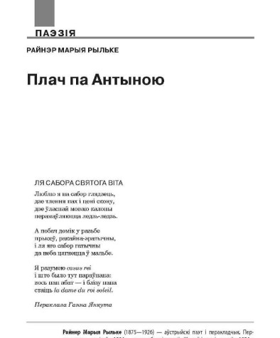 Аўтар(ы): Рыльке Райнер МарыяРыльке, Райнэр Марыя. Плач па Антыною [Вершы: Ля сабора святога Віта; Вечар; Прагулка; Эрас; Плач па Антыною] // № 9 (108) — 2011. С. 306—308. Пераклалі Ганна Янкута і Кацярына ...