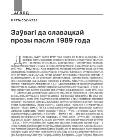 Аўтар(ы): Соўчкава МартаСоўчкава, Марта. Заўвагі да славацкай прозы пасьля 1989 году // № 9 (96) — 2010. С. 138—153. Бібліягр. у падрадк. заўвагах. Са славацкай паводле аўтарскага арыгіналу пераклала ...