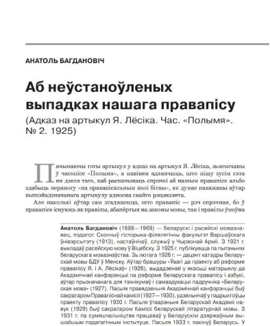 Аўтар(ы): Багдановіч АнатольБагдановіч, Анатоль. Аб неўстаноўленых выпадках нашага правапісу. (Адказ на артыкул Я. Лёсіка. Час. «Полымя». № 2. 1925) // № 11 (98) — 2010. С. 178—188. Публікуецца паводле: А. ...