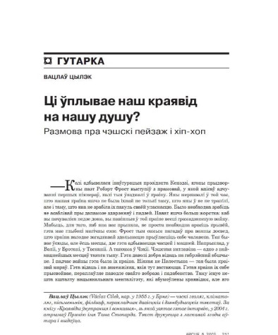 Аўтар(ы): Цылэк ВацлаўЦылэк, Вацлаў. Ці ўплывае наш краявід на нашу душу? Размова пра чэшскі пейзаж і хіп-хоп // № 6 (81) — 2009. С. 251—261: іл. Бібліягр. у падрадк. заўвагах. Гутарыў Ян Стэрн. ...