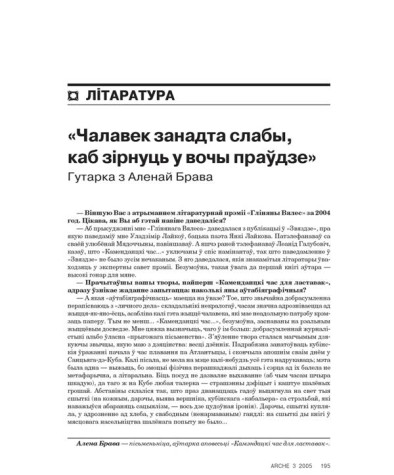 Аўтар(ы): Брава Алена«Чалавек занадта слабы, каб зірнуць у вочы праўдзе». Гутарка з Аленай Брава // № 3 (37) — 2005. С. 195—198. Гутарыў Алесь Аркуш.