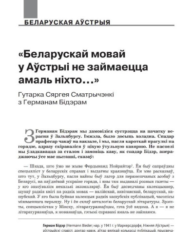 Аўтар(ы): Бідэр Герман«Беларускай мовай у Аўстрыі не займаецца амаль ніхто...». Гутарка Сяргея Сматрычэнкі з Германам Бідэрам // № 9 (108) — 2011. С. 444—453: іл. Бібліягр. у падрадк. заўвагах.