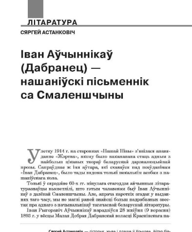 Аўтар(ы): Астанковіч СяргейАстанковіч, Сяргей. Іван Аўчыннікаў (Дабранец) — нашаніўскі пісьменнік са Смаленшчыны // № 9 (142) — 2015. С. 305—328: іл. Бібліягр. у падрадк. заўвагах.