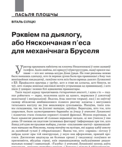 Аўтар(ы): Сіліцкі ВітальСіліцкі, Віталь. Рэквіем па дыялогу, або Няскончаная п’еса для механічнага Бруселя // № 1—2 (100—101) — 2011.С. 217—223: іл.