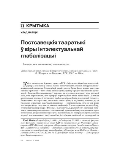 Навіцкі, Улад. Постсавецкія тэарэтыкі ў віры інтэлектуальнай глябалізацыі // № 4 (67) — 2008. С. 68—77. Бібліягр. у падрадк. заўвагах. Выданне, якое разглядаецца ў гэтым артыкуле: Европейская перспектива Беларуси: интеллектуальные модели / Сост. О. Шпарага. — Вильнюс: ЕГУ, 2007. — 280 с.