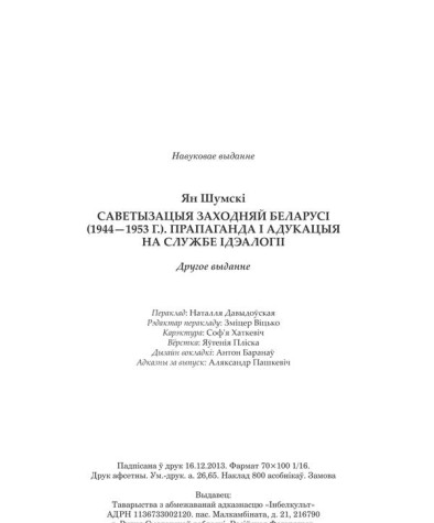 Шумскі Ян. Саветызацыя Заходняй Беларусі (1944—1953 г.). Прапаганда і адукацыя на службе ідэалогіі. Выходныя дадзеныя