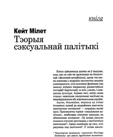 Мілет, Кейт. Тэорыя сэксуальнай палітыкі // № 3 (4) — 1999. С. 6—41. Пер. з ангельскай Андрэй Скурко паводле: Cate Millett. Sexual politics. New York, 1970.