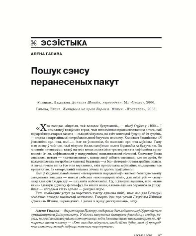 Аўтар(ы): Гапава АленаГапава, Алена. Пошук сэнсу перанесеных пакут // № 5 (56) — 2007. С. 87—92. Бібліягр. у падрадк. заўвагах. Выданьні, якія разглядаюцца ў артыкуле: 1) Улицкая, Людмила. Даниэль ...