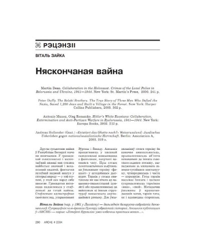 Аўтар(ы): Зайка ВітальЗайка, Віталь. Няскончаная вайна // № 4 (33) — 2004. С. 290—298. Выданьні, якія аглядаюцца ў артыкуле: 1) Martin Dean. Collaboration in the Holocaust. Crime of the Local Police ...